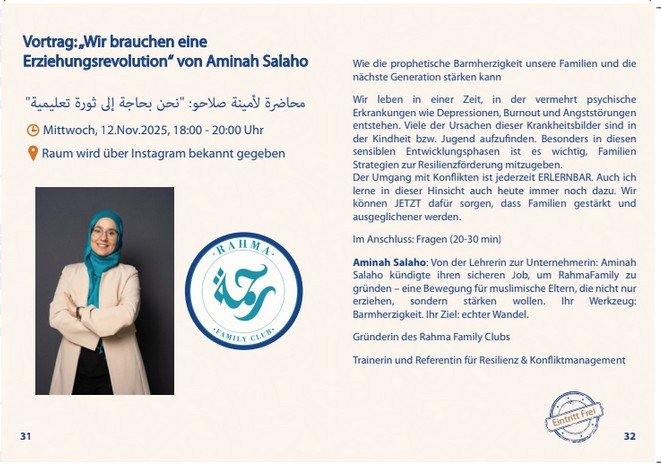 Der Vortrag „Wir brauchen eine Erziehungsrevolution“ von Aminah Sahlah war eine sehr interessante und aufschlussreiche Veranstaltung. Sie sprach darüber, wie die Prinzipien der prophetischen Barmherzigkeit Familien und die nächste Generation stärken können. Besonders betonte sie, wie wichtig es ist, Resilienzstrategien zu vermitteln, um psychischen Erkrankungen wie Depressionen und Ängsten vorzubeugen. Der Umgang mit Konflikten in der Familie wurde ebenfalls thematisiert, wobei Aminah wertvolle Einblicke und praktische Lösungen zur Förderung eines positiven familiären Umfelds gab. Die Teilnehmer konnten im Anschluss ihre Fragen stellen und mehr über die Anwendung dieser Prinzipien im Alltag erfahren.
