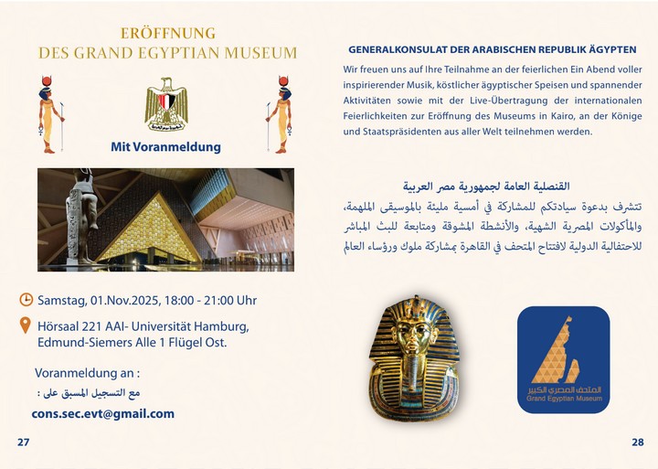 Die Veranstaltung wurde feierlich von Frau General Konsulin Dalia Abdelfattah, Generalkonsulin Ägyptens, eröffnet. In ihrer Ansprache betonte sie die Bedeutung des interkulturellen Austauschs und würdigte die reiche kulturelle Geschichte Ägyptens sowie die Bemühungen, diese Traditionen einer breiten Öffentlichkeit zugänglich zu machen.