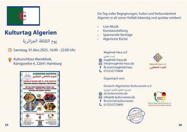 In den Arabischen Kulturwochen begegnen sich Menschen – nicht nur Kulturen. Hier geht es um offene Gespräche, ein Lächeln, das Brücken baut, und Geschichten, die uns berühren. Ob bei Musik, Kunst oder einfach nur im Austausch – wir entdecken das, was uns alle verbindet: die Menschlichkeit. Hamburg ist ein Ort, an dem Vielfalt nicht trennt, sondern vereint.